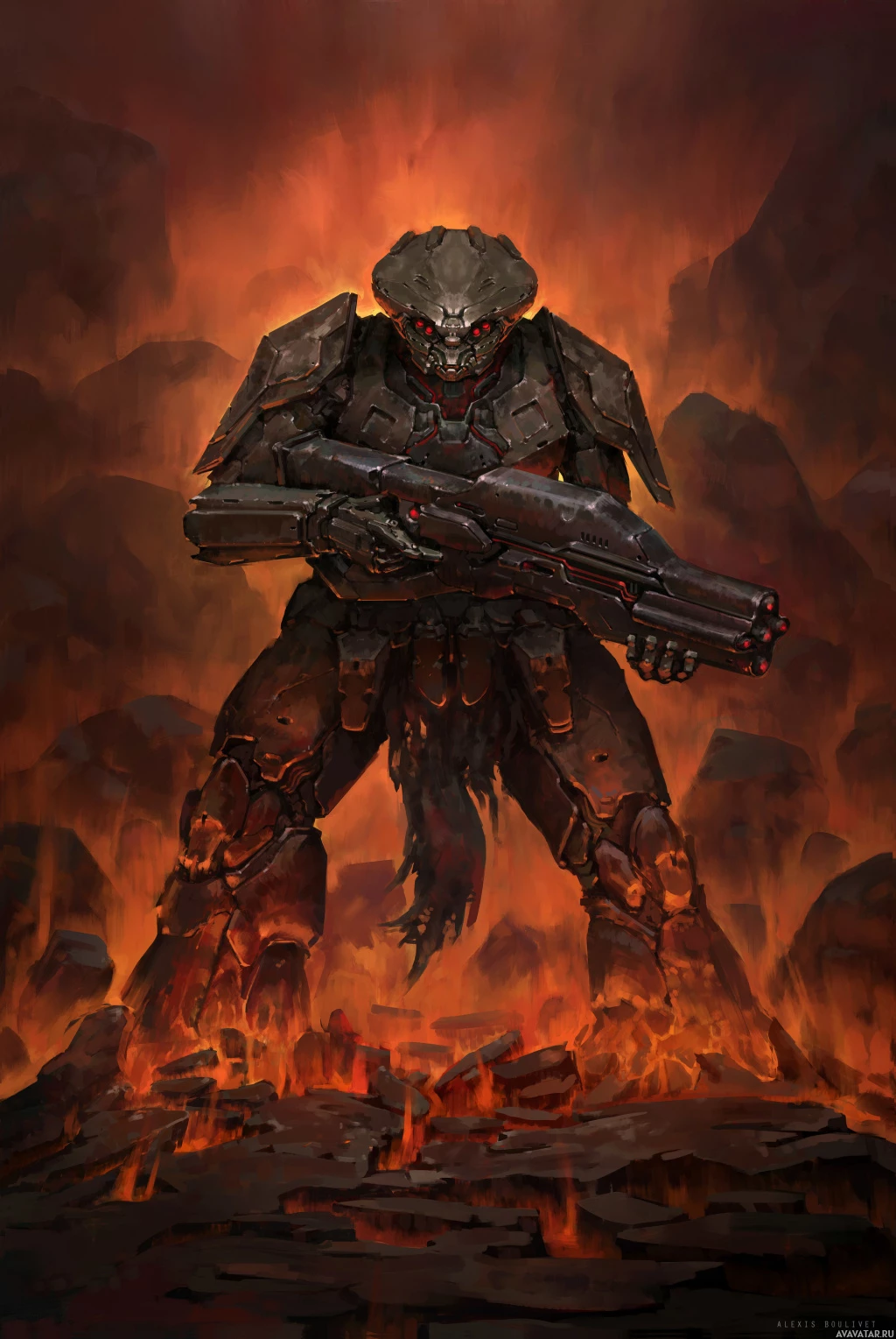 На картинке изображен персонаж из жанра научной фантастики. Этот персонаж одет в доспехи и держит в руках что-то похожее на футуристическое оружие, возможно, пистолет или бластер. Обстановка довольно драматичная, с лавой или расплавленной скалой под ногами персонажа и огненным окружением, что наводит на мысль о том, что это могло быть из остросюжетной или приключенческой истории в научно-фантастической вселенной.