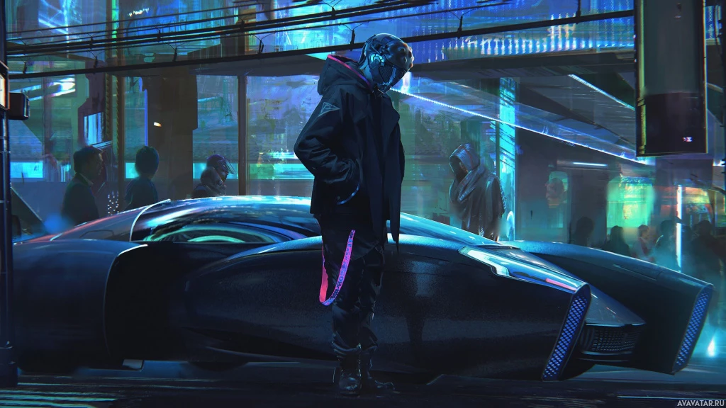 urban scene with a man standing beside a sleek, high-tech vehicle. The setting appears to be in the nighttime as evidenced by the glowing