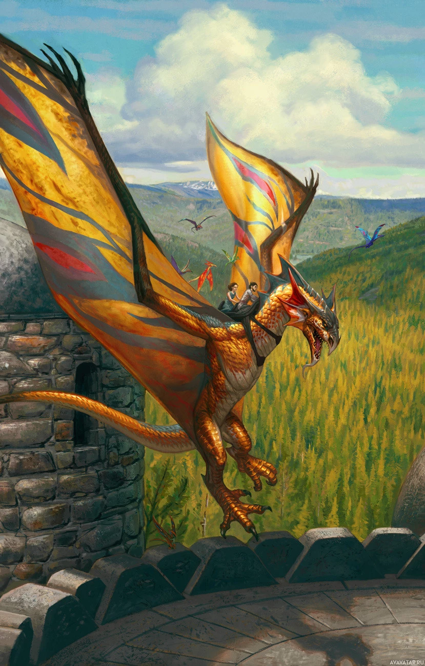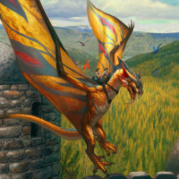 fantasy literature. In this artwork, the wyvern is shown soaring over a landscape that appears to be a medieval-style setting with castles and forests. The creature has large, spread wings and is displaying a fierce expression as it flies, possibly indicating its role as a powerful or menacing figure in this