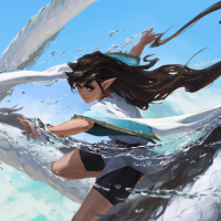 long hair and is wearing a white top with blue accents, and they seem to be in motion as if they are surfing on the wave created by the creature's movement through the water. The background suggests an open ocean environment under