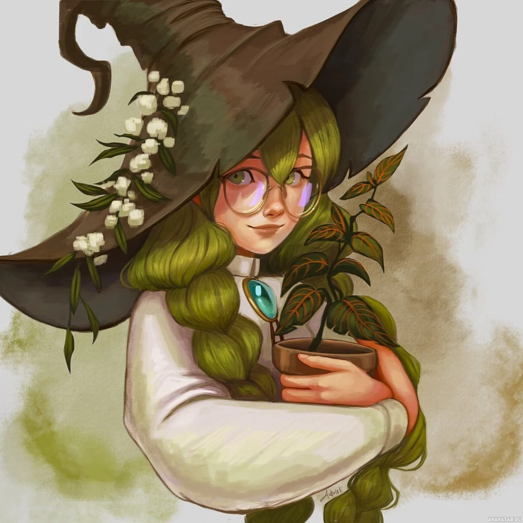The image shows an illustration of a character wearing glasses, a green hair wig with braids, and a witch hat. She is holding a small plant in her hands. The character appears to be smiling and has a friendly expression.