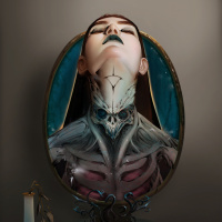 mirror frame that gives the impression that her face is part of the reflection. The overall atmosphere suggests a theme that could be related to fantasy or