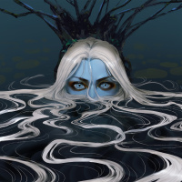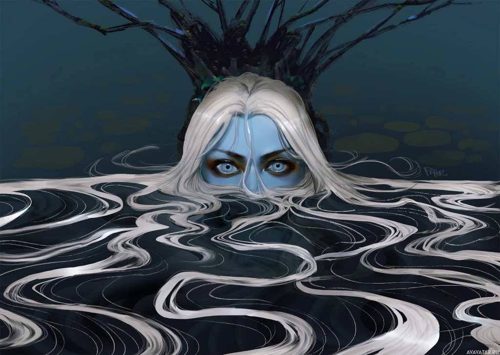 the aquatic setting and the fish-like tail visible at the bottom of the image. The overall tone is somewhat dark, with the character's face obscured by their
