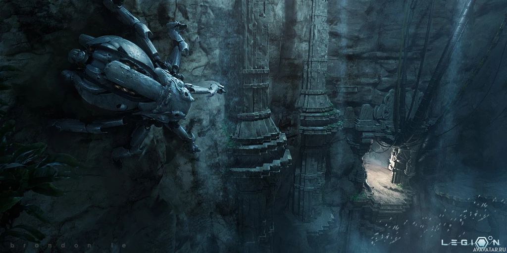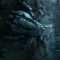 a robotic character standing in an underground cave-like environment, with other mechanical elements scattered around. The atmosphere suggests a storyline that combines themes of exploration and perhaps survival or discovery in