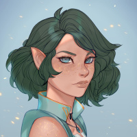 This is an illustration of a fantasy character who appears to be an elf. The character has green skin, pointed ears, and is depicted with a serious expression. They have short hair and are wearing what seems to be armor or a garment with stylized accents and a necklace. The background has a subtle glowing effect that gives the impression of magical energy.