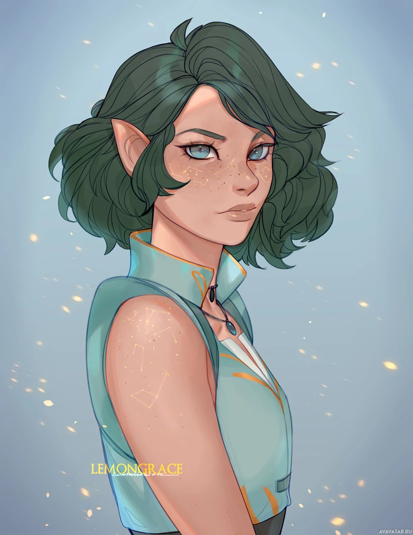 Это иллюстрация фантастического персонажа, который выглядит как эльф. У персонажа зеленая кожа, заостренные уши, и он изображен с серьезным выражением лица. У него короткие волосы и он одет во что-то похожее на доспехи или одежду со стилизованными вставками и ожерельем. Фон обладает тонким светящимся эффектом, который создает впечатление магической энергии.