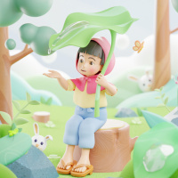 an animated character, a young girl, sitting on a stump in a forest. She is surrounded by various elements of nature such as trees, leaves, grass, and a rabbit. There are also