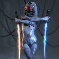 a science fiction or fantasy theme. The background includes industrial elements such as pipes and wires, enhancing