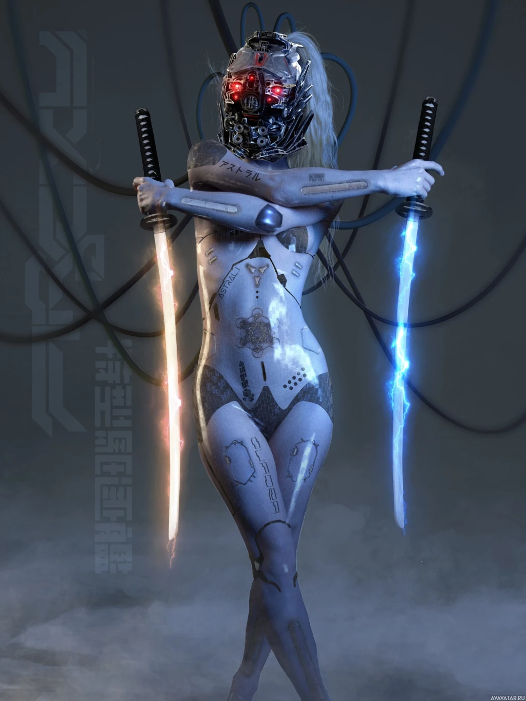 red eyes. It is holding two swords crossed in front of it, which suggests