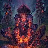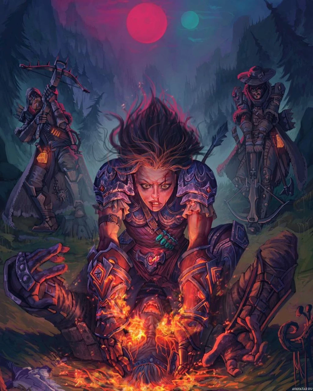 a fantasy setting. In the center, there's a girl with fiery