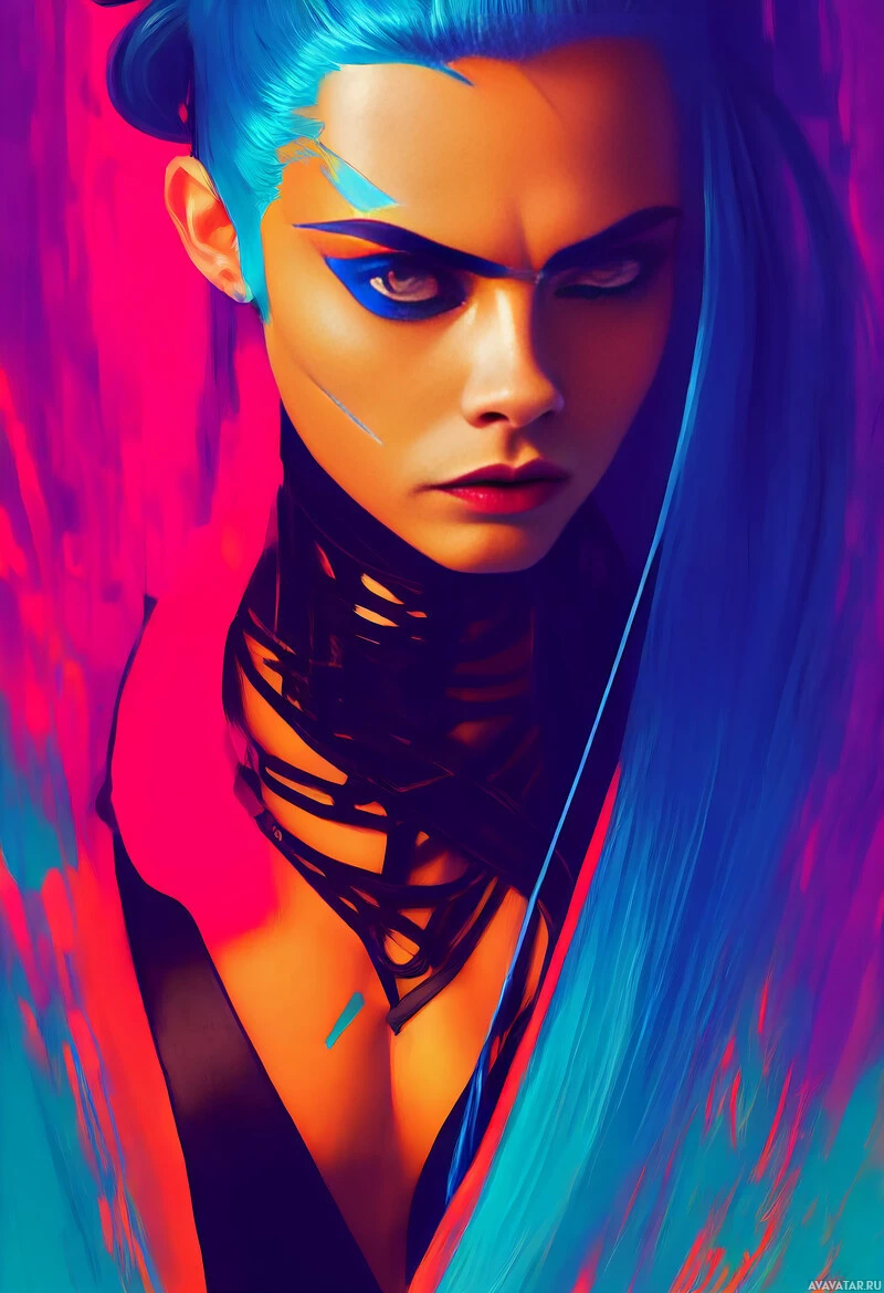 На картинке изображена цифровая иллюстрация женского персонажа с голубыми волосами. У нее напряженное выражение лица, возможно, передающее уверенность или решительность. В работе использованы яркие цвета и динамичные мазки кисти, которые придают ей ощущение движения и энергии.