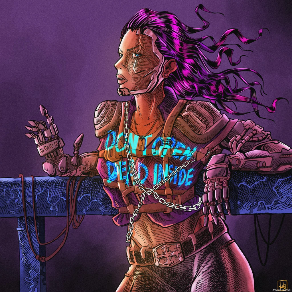 a science fiction theme, possibly indicating she is a cyborg or android character. The phrase "DO NOT OPEN DEAD INSIDE" is prominently displayed on her attire, which could imply the warning label on a robot or android as depicted in
