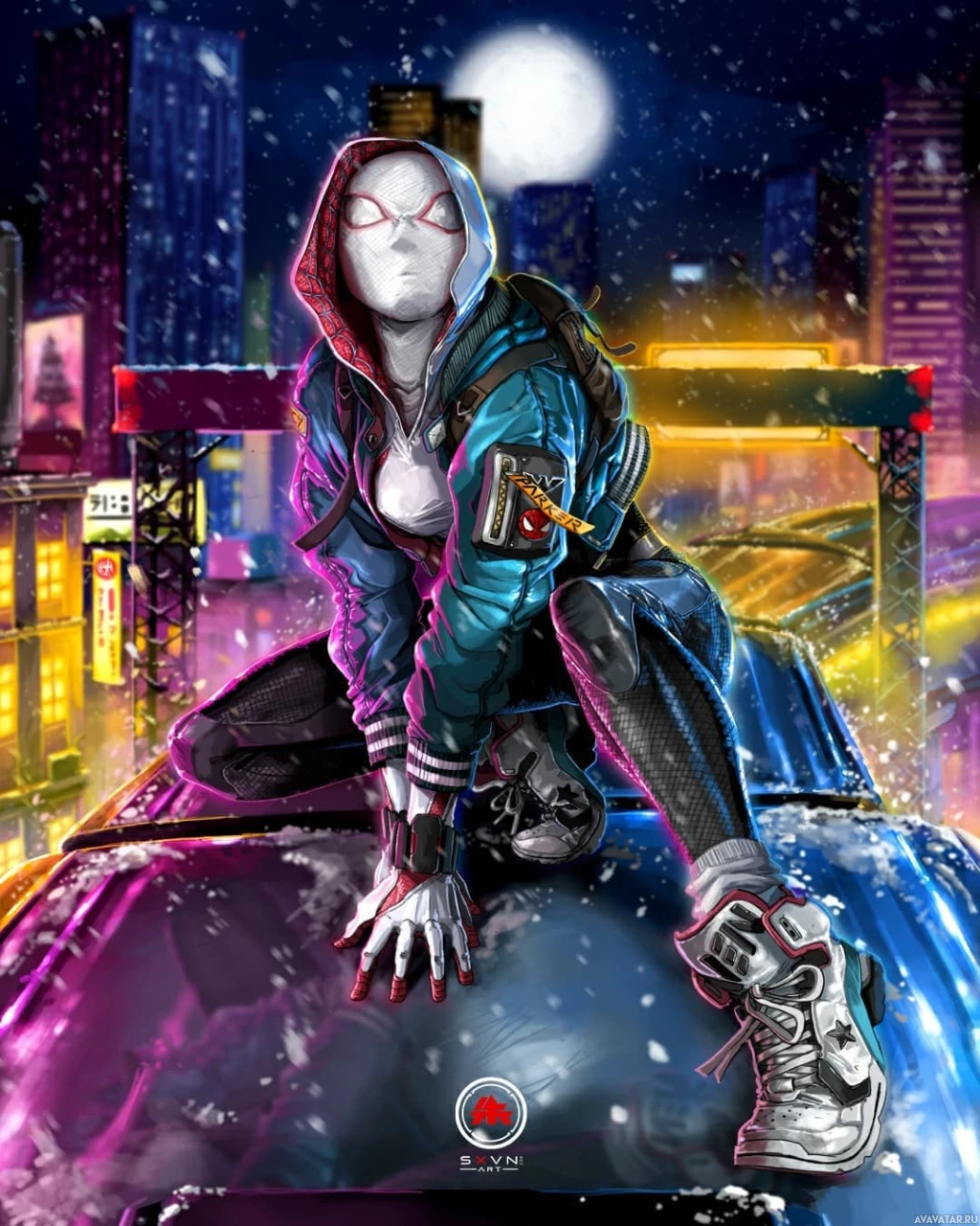 a hooded outfit with a mask that obscures her face. She is perched on a rooftop at night, with a cityscape featuring neon lights and