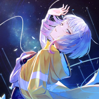 a yellow outfit with white accents. The background features a starry sky with a large planet and some floral elements, suggesting a setting that combines aspects of both
