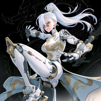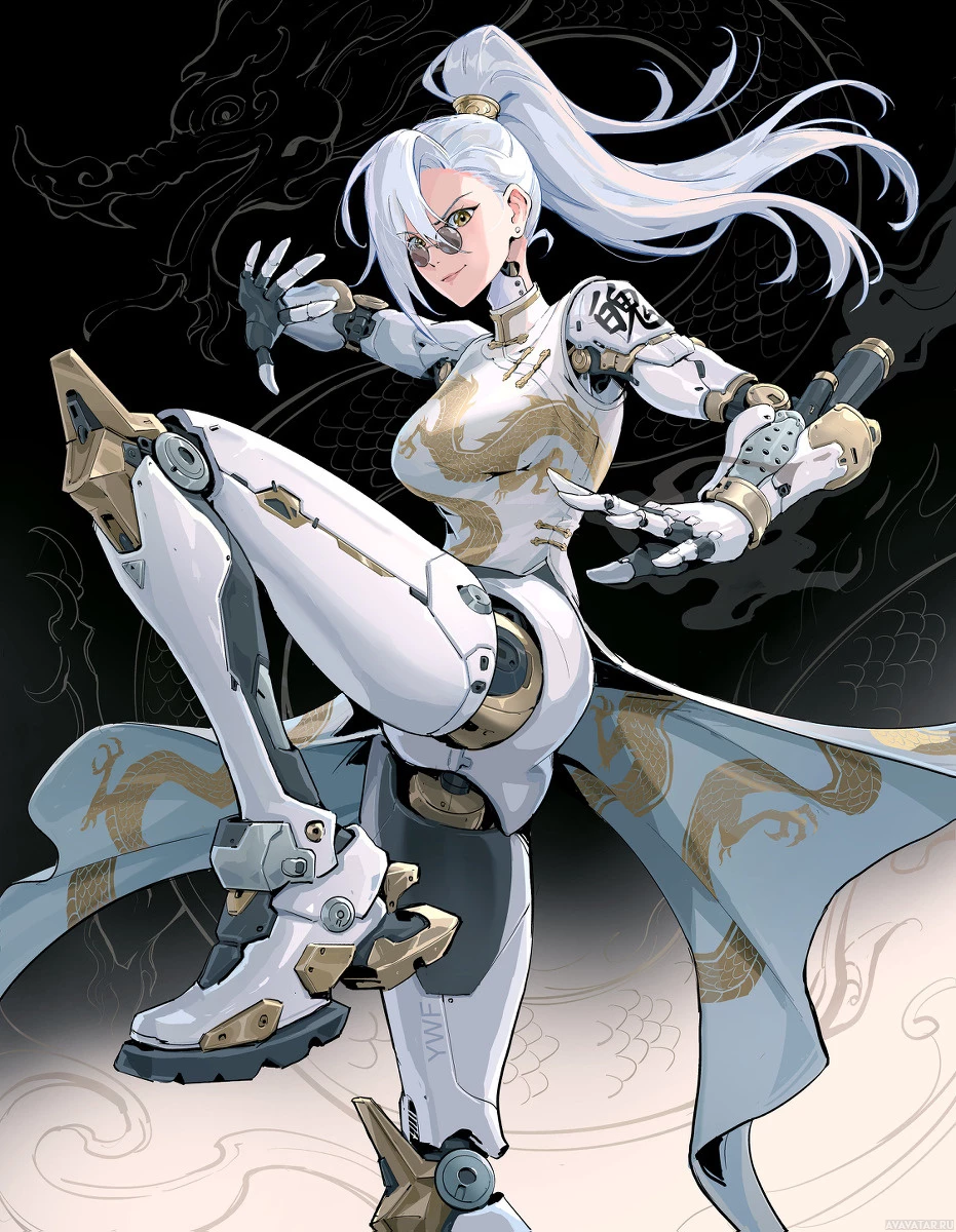 white hair and a futuristic design. She appears to be dressed in armor or a robotic exoskeleton, which suggests she is part of