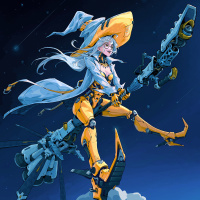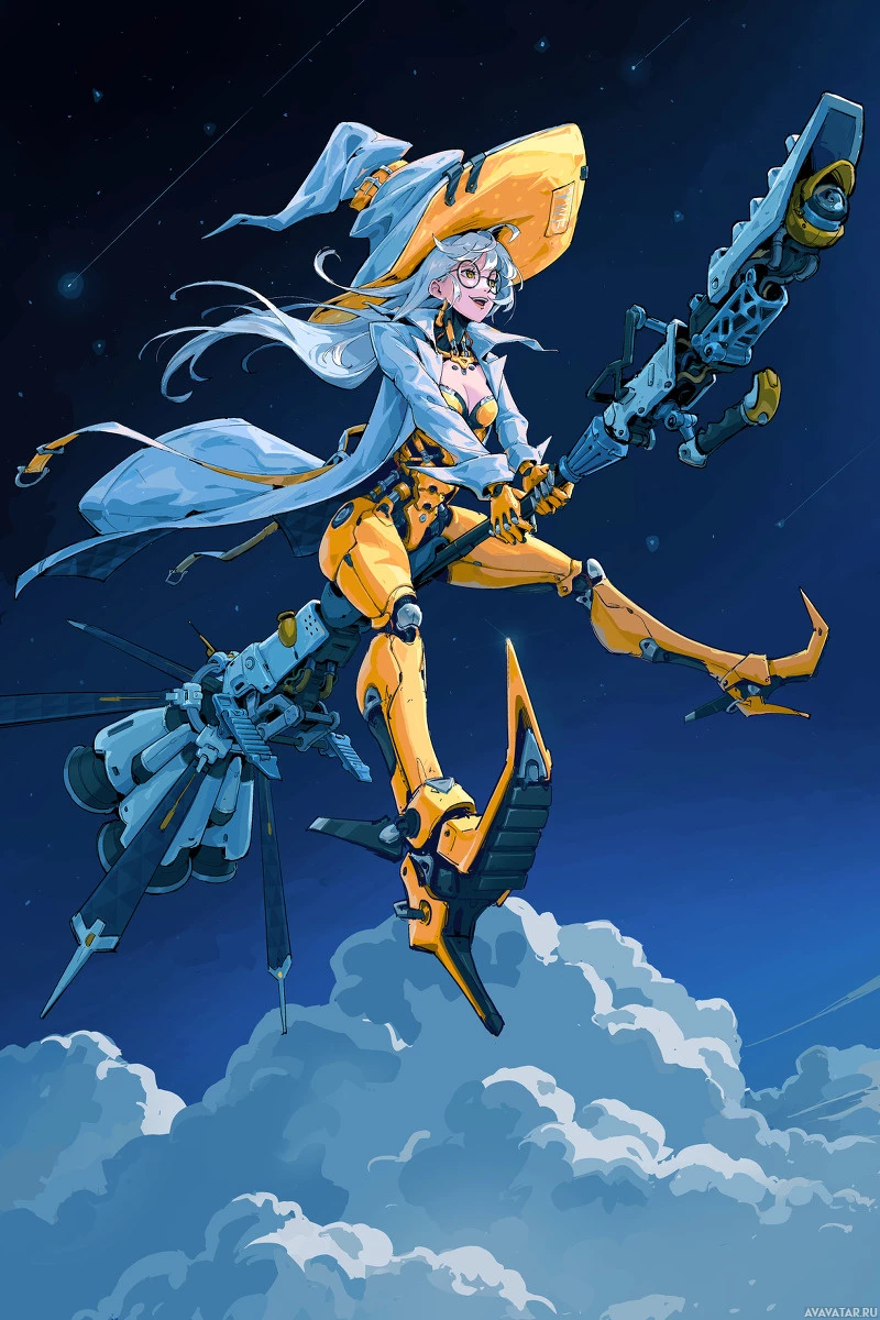 a female character with white hair, wearing a witch hat and holding what appears to be a magical wand. She is suspended in the air by two