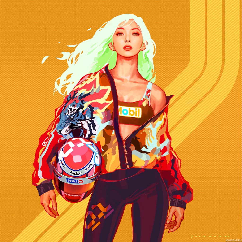 various designs on it, including what appears to be a dragon, and she has a helmet under her arm. Her pose suggests motion, like she might be in the middle of riding a bike or car. The background features retro-futuristic stripes that give