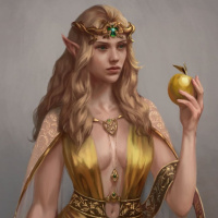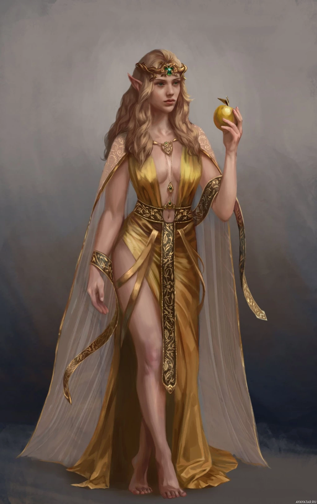 a small apple or fruit, possibly symbolizing something significant in the context of the story or lore from which this character originates. The background is neutral, allowing the focus to remain on the elf and her attire.
