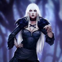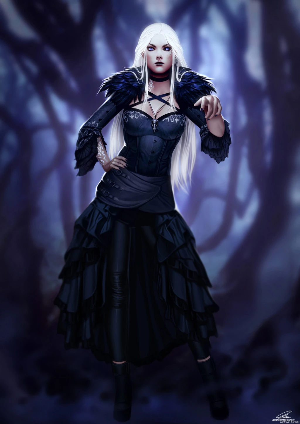 blue eyes and is wearing a dark gothic-style outfit with ruffles and black accents. Her expression appears confident, even defiant, with her head turned to the side and one hand resting on her hip. The background suggests a forest setting at night or during twilight, with tall trees silhouetted against