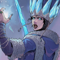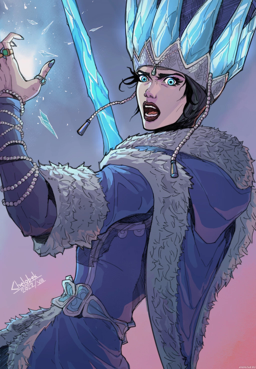 an elaborate costume and headgear with crystal-like accents, suggesting they might represent royalty or have a high status within the story's universe. They are holding what looks like a staff or wand in their right hand, which could imply they possess