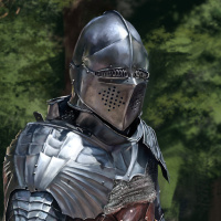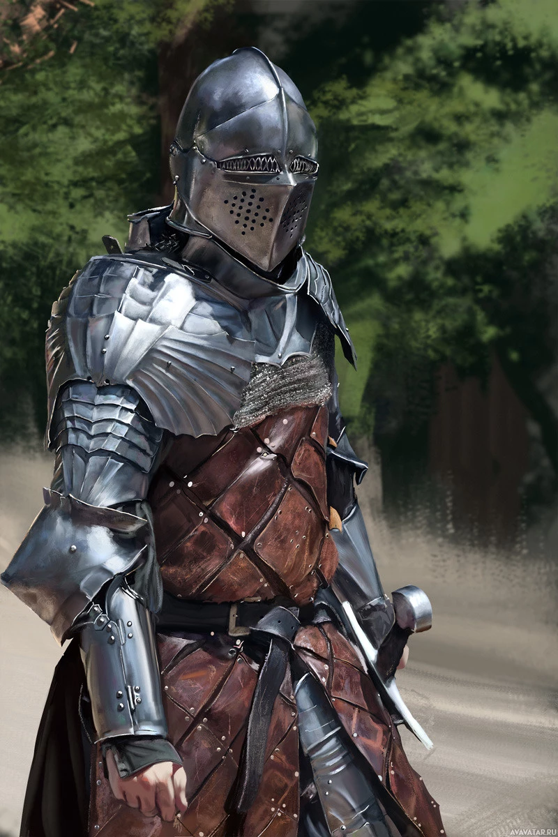 medieval armor, which includes plate armor with a visor and breastplate, along with chain mail or plate elements on the torso. This attire suggests that the figure could be a warrior or a knight from