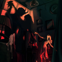 an unexpected companion - a devil-like figure in shadow form. The setting looks like an old, slightly run-down room with a window allowing