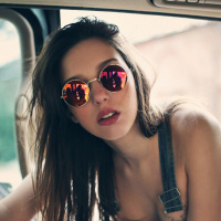 На картинке изображена женщина с длинными каштановыми волосами, одетая в джинсовый комбинезон и солнцезащитные очки. Она смотрит в окно автомобиля. Кажется, что она находится в непринужденной обстановке.