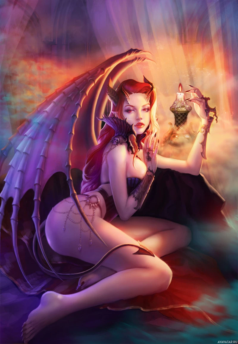 red hair, and is adorned with demonic features such as wings, horns, and a tail that resemble those of a snake or dragon. She is seated on what looks like a stone throne or pedestal, with a dramatic background featuring warm, glowing colors that suggest