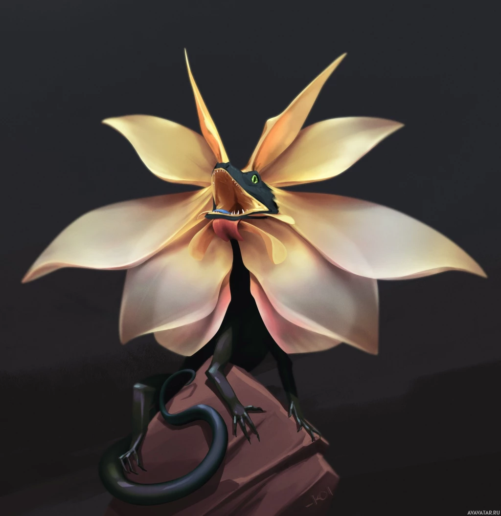 large petals like a flower's bloom around its neck, shoulders, and back. The creature also has prominent yellow and orange hues in its scales, which adds to its unusual and fantastical nature.