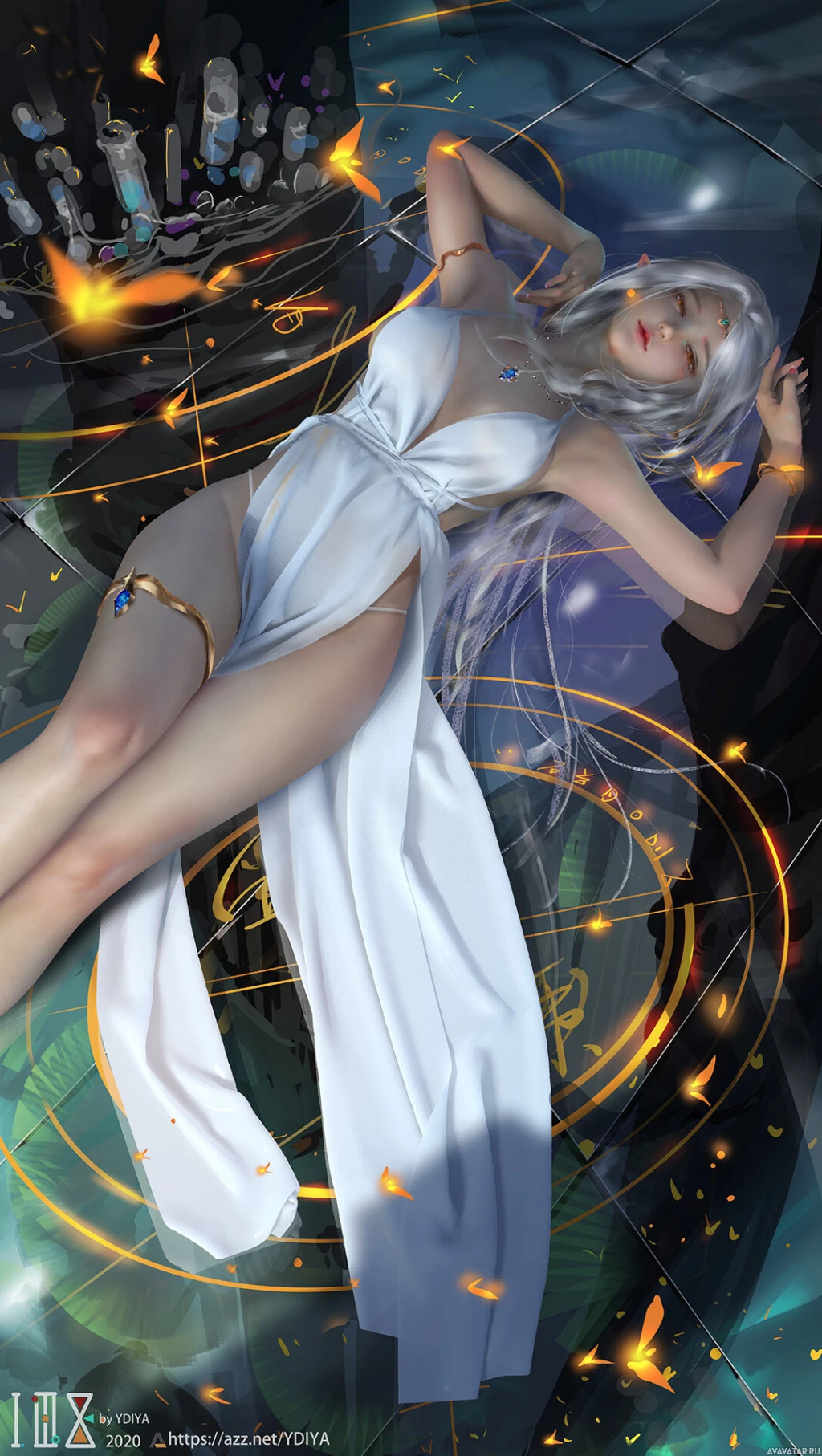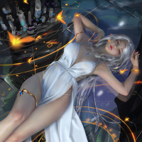 a sleek outfit that resembles a dress with flowing elements, and there's a design that looks like a star or galaxy pattern at her feet. The background features glowing
