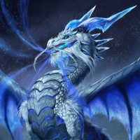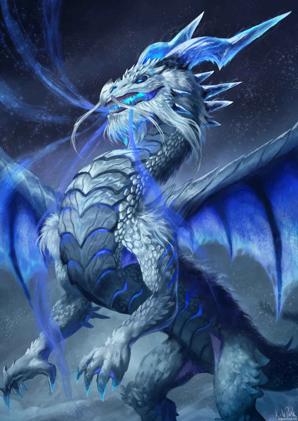 a fantasy creature that resembles a dragon, characterized by its large wings and a prominent tail. It has an icy or crystalline appearance, with shades of blue and white dominating its body. The dragon is standing on what appears to be ice or snow, emitting smoke or steam from its mouth. The overall style suggests that this creature may be part of a fantasy genre, possibly in a role-playing game, book cover, or a piece of concept art for