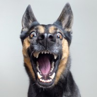 На снимке изображена немецкая овчарка с широко открытым ртом, которая зевает или издает странный шум. Собака имеет черную и загорелую шерсть и выглядит удивленной или забавной.