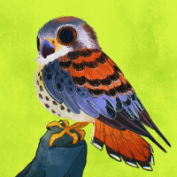 The image features a colorful illustration of an animal, specifically a bird, perched on what appears to be a rock. This is a drawing of an American Kestrel, a type of falcon, characterized by its vibrant plumage and distinctive eye pattern.