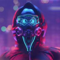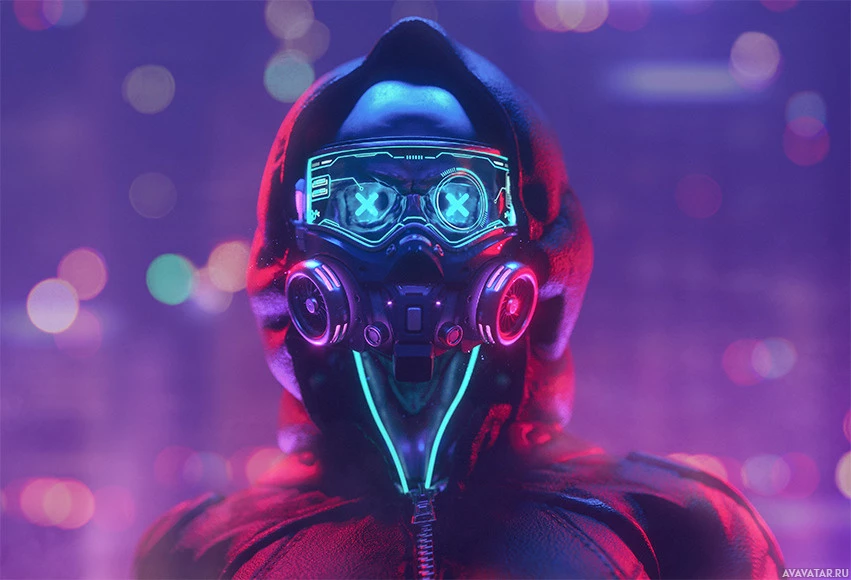 hooded outfit with a mask and visor. The mask has a high-tech design, suggesting