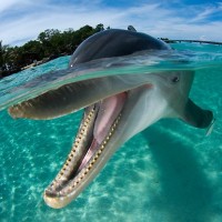 blue water. The dolphin is facing the camera with its mouth open, displaying its teeth and tongue. It appears to be smiling or possibly vocalizing. The background features an underwater view of