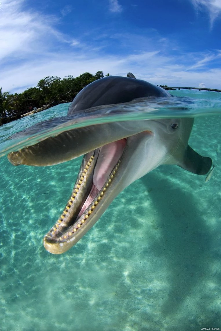 The image shows a dolphin swimming in clear