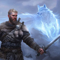 an ethereal creature resembling a wolf in flight, which could suggest a spirit or ghostly entity associated with the character. The overall atmosphere of the image suggests a high-fantasy setting, possibly from