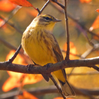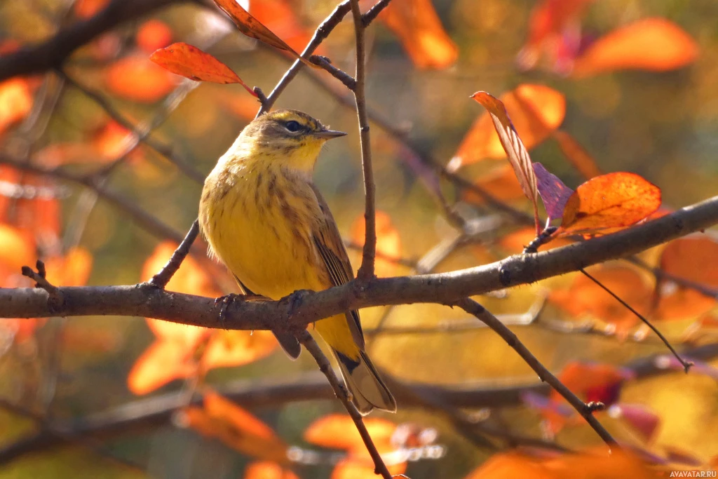 fall foliage, with the leaves turning colors such as red and orange. This suggests that the photo was taken during autumn when trees lose their leaves. The bird seems at rest, enjoying its position on the branch.
