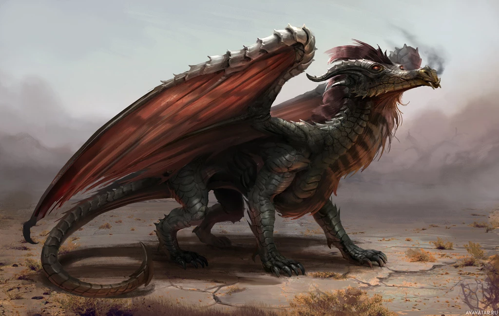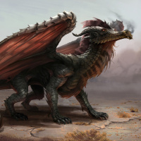red feathers, and a head that includes horns or spikes. The setting appears to be barren, possibly desert-like, with little vegetation visible in the background. The artwork showcases the creature standing upright on two legs, which is not a natural posture for dragons but is often depicted in fantasy genres as a way to anthropomorphize or give human-like characteristics to these