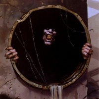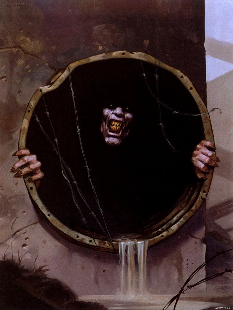 The image depicts a fantasy or horror-themed illustration of a person peeking out from inside an upside-down sewer manhole. The character appears to be menacing, with exaggerated facial features and expressions that suggest anger or aggression. The scene is set against a dark, ominous background that adds to