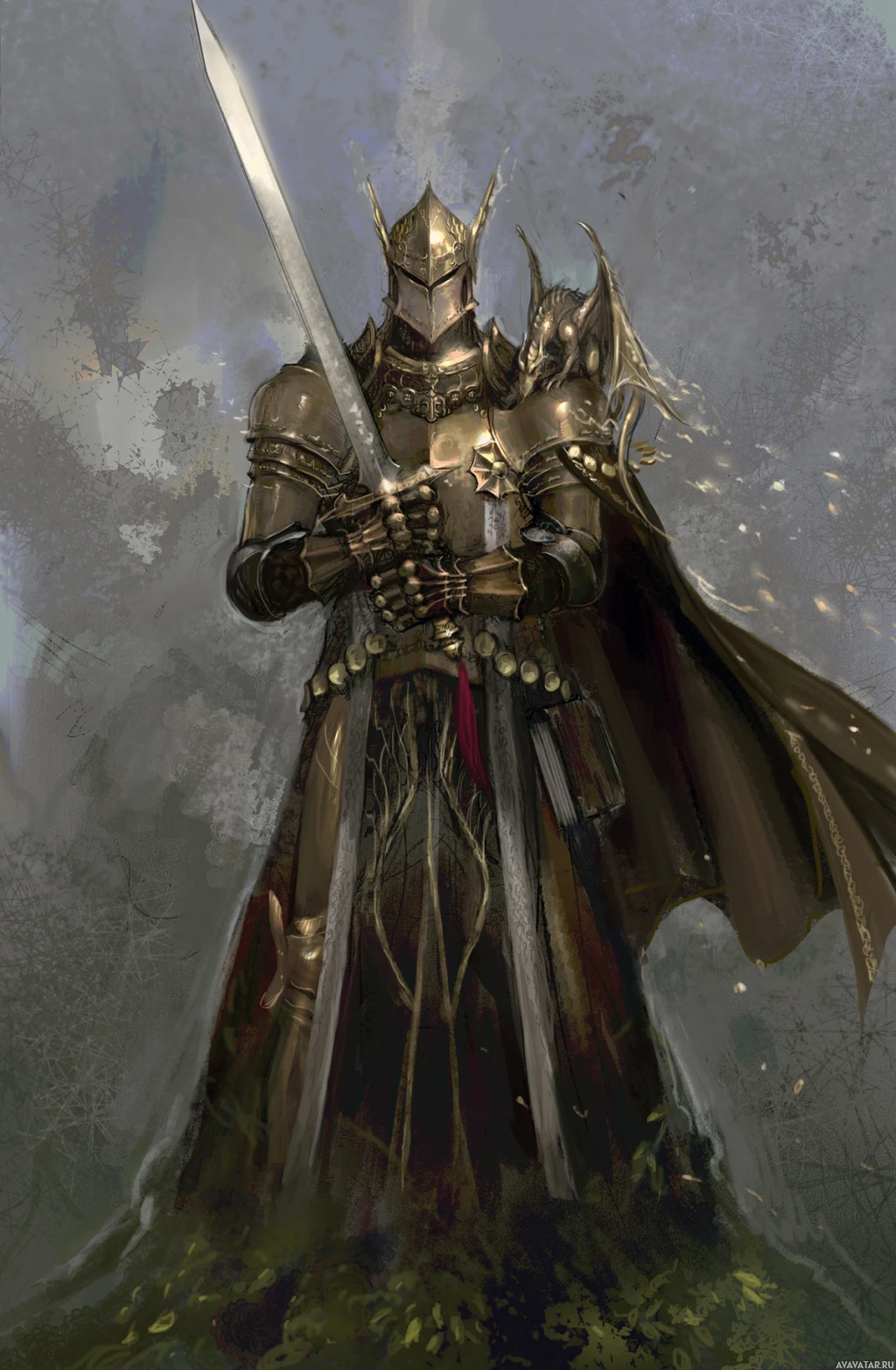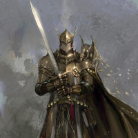 intricate patterns and embellishments that suggest royal or noble status. They are holding a sword, which is a typical weapon of warriors from such
