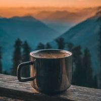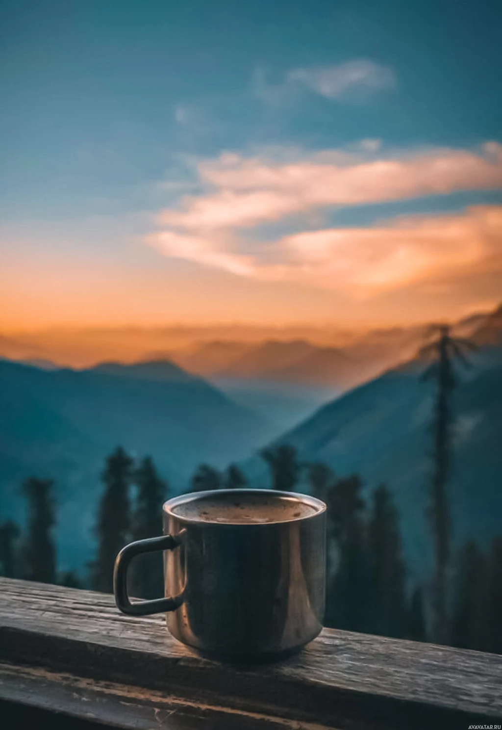 a clear sky. In the foreground, there is a mug of coffee placed on a wooden surface, which could be a balcony or deck railing, suggesting someone might be enjoying a warm beverage while taking in