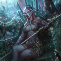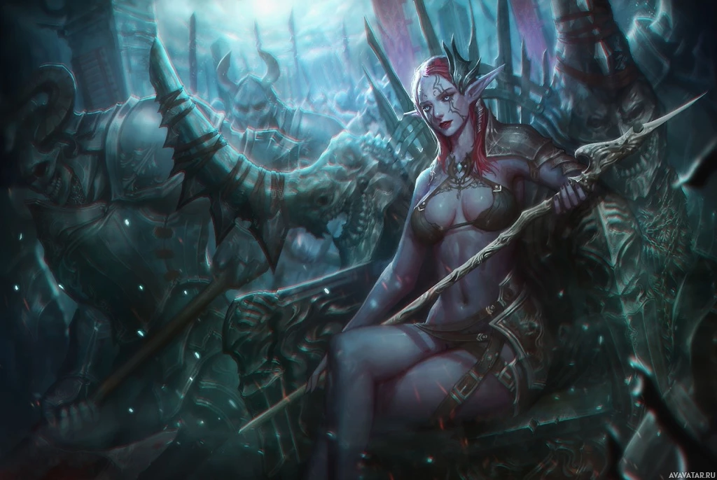 a fantasy scene featuring characters that appear to be drow, an elven race from the Dungeons & Dragons (D&D) role-playing game. In the center, there's a character with purple skin and