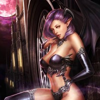 a female character with fantasy and vampire themes. She has elongated teeth, which is typical for vampires, and she's wearing