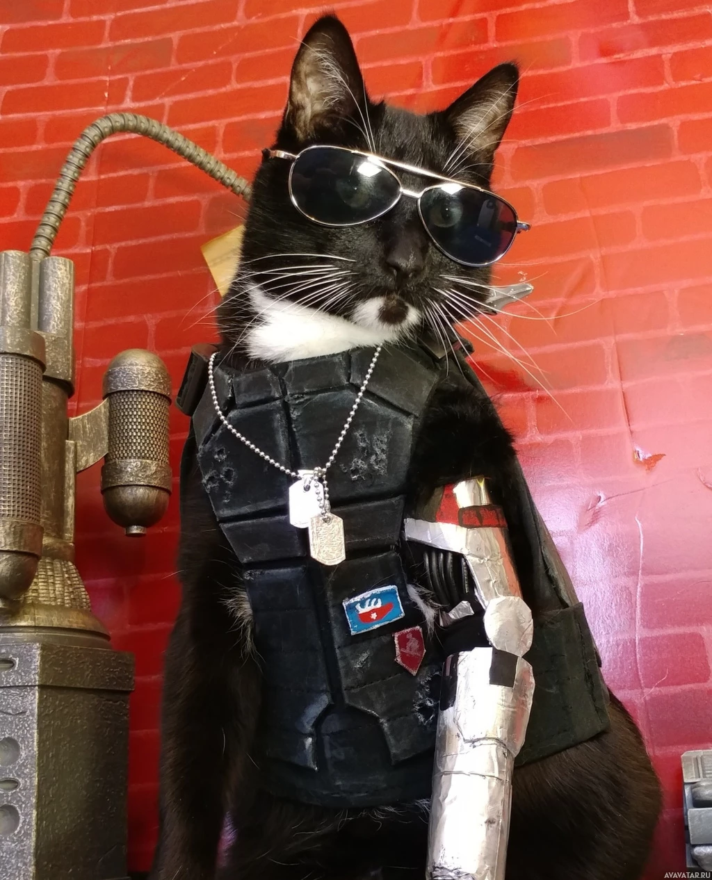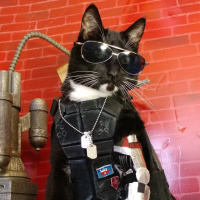 The image shows a cat dressed in human-like attire, including sunglasses, and wearing what appears to be an outfit inspired by the character Johnny Silverhand from