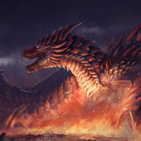 The image depicts a fantasy-themed scene with a dragon as the central figure. The dragon appears to be fierce and powerful, standing amidst flames that are consuming nearby structures. It's a dramatic and intense illustration, likely associated with themes of mythology or fantasy literature. The use of lighting and shadow gives it an epic and somewhat ominous atmosphere.