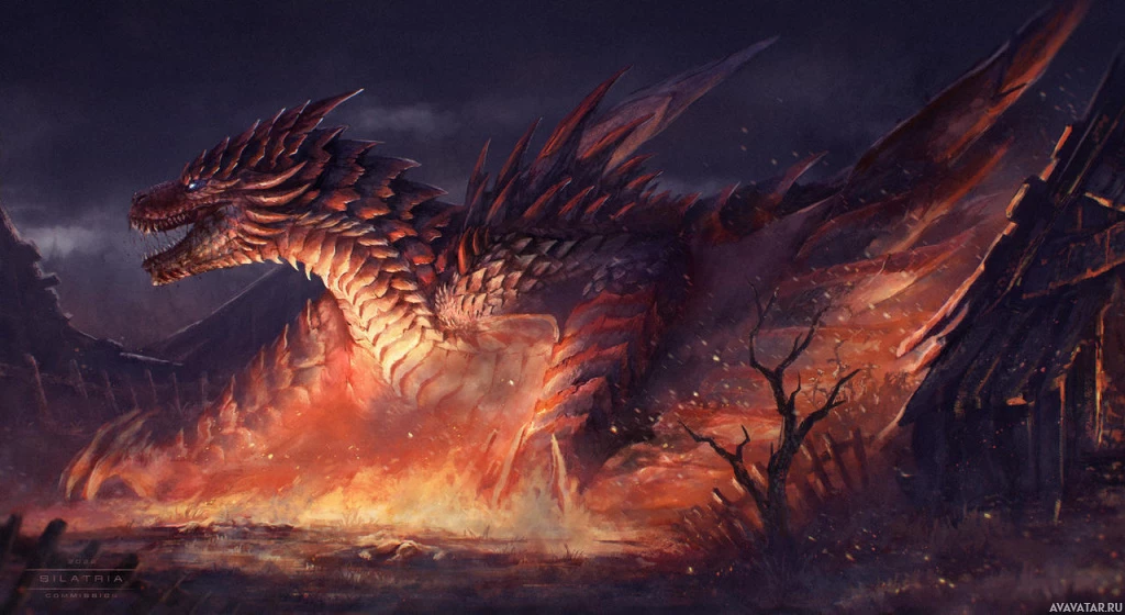 На картинке изображена сцена в стиле фэнтези с драконом в качестве центральной фигуры. Дракон выглядит свирепым и могущественным, стоя посреди пламени, пожирающего близлежащие строения. Это драматичная и насыщенная иллюстрация, вероятно, связанная с темами мифологии или фантастической литературы. Использование света и тени придает ему эпическую и несколько зловещую атмосферу.