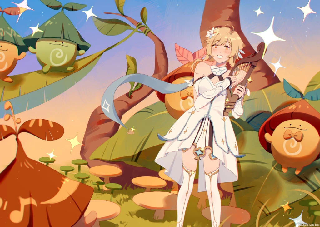 an animated character standing in a whimsical, fantasy setting. The character appears to be Lumine from the game "