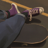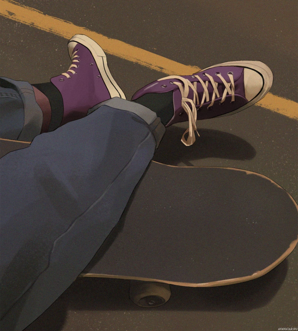 blue jeans and purple sneakers, with their legs crossed over the skateboard. The background appears to be a paved surface, possibly indicating