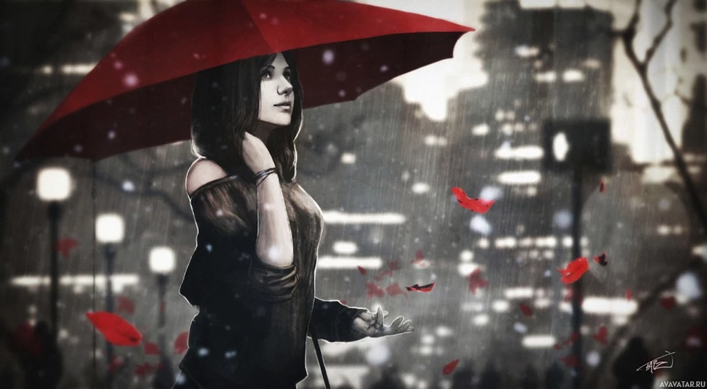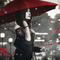 a young woman with short brown hair, holding a bright red umbrella. She appears to be walking in the rain or possibly during a snowfall, given